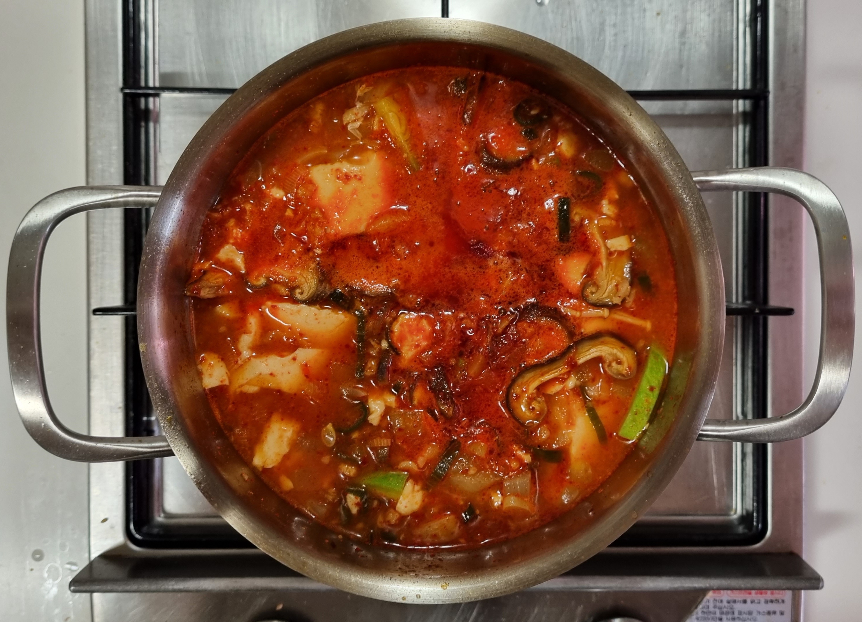 4) 다진 마늘과 양념이 잘 섞인 뒤 물이나 육수를 넣고 끓여줍니다. 끓는 물에 두부와 함께 다양한 채소를 넣어줍니다. 대표적인 채소로는 양파, 대파, 얼갈이 양배추 등이 있습니다. 또한 김치를 넣는 것도 선택 사항입니다. 이때, 물이 끓어오르면서 순두부찌개의 특유의 향긋한 향이 전해집니다.